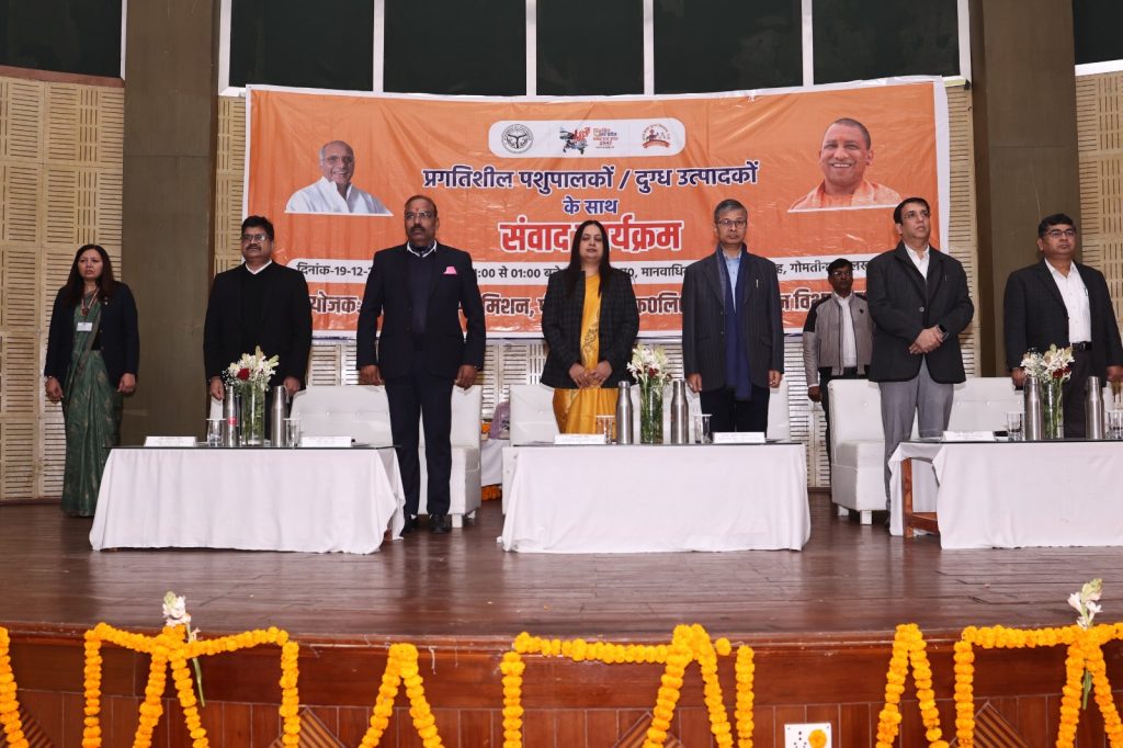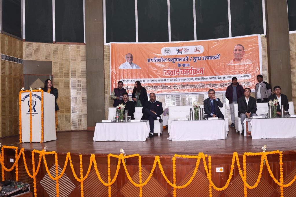 लखनऊ: 19 दिसम्बर, 2025 उत्तर प्रदेश के दुग्ध विकास विभाग आज यहां उ0प्र0 मानवाधिकार आयोग, गोमती नगर लखनऊ के प्रेक्षागृह में नन्द बाबा दुग्ध मिशन की योजनाओं के लाभार्थियों एवं प्रगतिशील पशुपालकों/दुग्ध उत्पादकों के साथ संवाद कार्यक्रम श्री मुकेश कुमार मेश्राम, प्रमुख सचिव, पशुधन एवं दुग्ध विकास, उ0प्र0 शासन की अध्यक्षता में सम्पन्न हुआ। जिसमें श्रीमती धनलक्ष्मी के0, दुग्ध आयुक्त/मिशन निदेशक, नन्द बाबा दुग्ध मिशन, श्री वैभव श्रीवास्तव, प्रबन्ध निदेशक, पीसीडीएफ लि0, श्री देवेन्द्र पाण्डेय, विशेष सचिव, पशुधन, उ0प्र0 शासन, श्री राम सहाय यादव, विशेष सचिव, दुग्ध विकास उ0प्र0 शासन एवं अन्य अधिकारीगण उपस्थित रहे।संवाद कार्यक्रम में विभिन्न जनपदों से 170 से अधिक मिशन की योजनाओं के लाभार्थी एवं पशुपालक द्वारा प्रतिभाग किया गया। नन्द बाबा दुग्ध मिशन के अन्तर्गत संचालित विभिन्न योजनाओं के लाभार्थियों द्वारा योजनाओं के क्रियान्वयन में आ रही कठिनाइयों/समस्याओं से अवगत कराया गया, जिसमें मुख्य रूप से बैंक ऋण की स्वीकृति में बैंकों द्वारा अपेक्षित सहयोग न करना, ग्रामीण स्तर पर योजनाओं के प्रचार-प्रसार की कमी, योजनाओं के क्रियान्वयन हेतु व्यवहारिक प्रशिक्षण की आवश्यकता एवं स्वदेशी उन्नत नस्ल के दुधारू गौ-वंश का क्रय बाह्य प्रदेशों से करने में आ रही कठिनाइयों से अवगत कराया गया