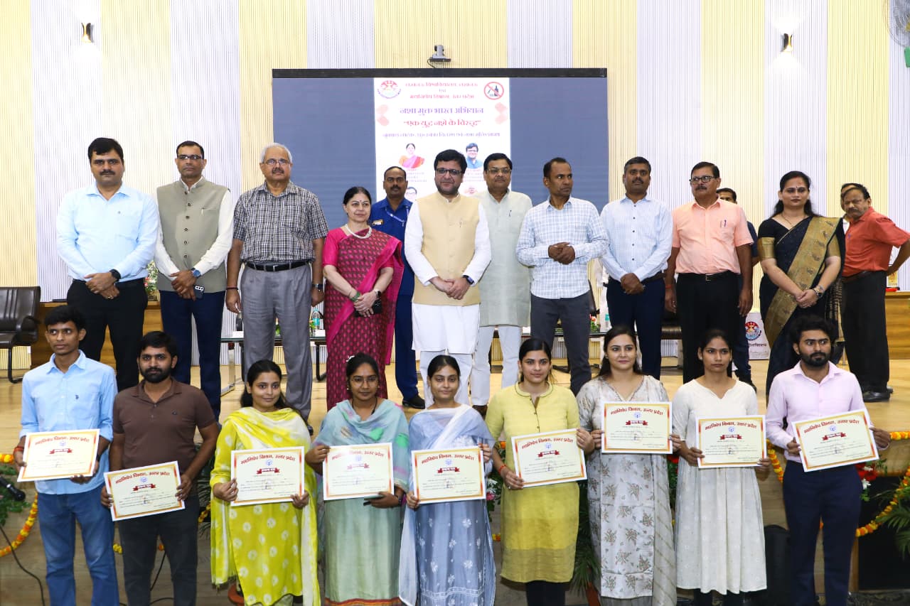 लखनऊ विश्वविद्यालय में ’सेवा पखवाड़ा अभियान’ के तहत नशा विरोधी संगोष्ठी का आयोजनविकसित भारत के विज़न को मूर्तरूप देने हेतु सभी को विशेषकर युवाओं को पूर्ण मनोयोग से योगदान देने की आवश्यकता-श्री नितिन अग्रवालइस अवसर पर कार्यक्रम में मौजूद सभी युवाओं को नशा विरोधी शपथ दिलायी गईदेश के प्रधानमंत्री जी के जन्मदिवस के अवसर पर प्रारम्भ हुए ’सेवा पखवाड़ा अभियान’ तथा नशा मुक्त भारत अभियान के तहत मद्यनिषेध विभाग द्वारा युवाओं को मादक पदार्थों के दुष्परिणामों के प्रति जागरूक किये जाने हेतु आज लखनऊ विश्वविद्यालय के ए०पी० सेन सभागार में नशा विरोधी जनजागरूकता कार्यक्रम/संगोष्ठी का आयोजन किया गया। कार्यक्रम प्रदेश के आबकारी एवं मद्यनिषेध राज्यमंत्री (स्वतंत्र प्रभार) श्री नितिन अग्रवाल मुख्य अतिथि के रूप में शामिल हुए। इस अवसर श्री अग्रवाल ने सभागार में उपस्थित छात्र/छात्राओं को सम्बोधित करते हुए कहा कि मा० प्रधानमंत्री जी का विजन-2047 युवाओं पर केन्द्रित है। इसलिए विकसित भारत के विज़न को मूर्तरूप देने हेतु सभी को विशेषकर युवाओं को पूर्ण मनोयोग से योगदान देने की आवश्यकता है। इसके लिये युवाओं का नशा मुक्त होना अत्यन्त आवश्यक है। उन्होंने कहा कि युवा इस देश का भविष्य हैं, उनको यह तय करना है वह किस भारत में रहना चाहते हैं। आने वाले समय में आप कही जायें और कहें हम भारत से आये है, तो लोग सर झुकाकर बात करें।