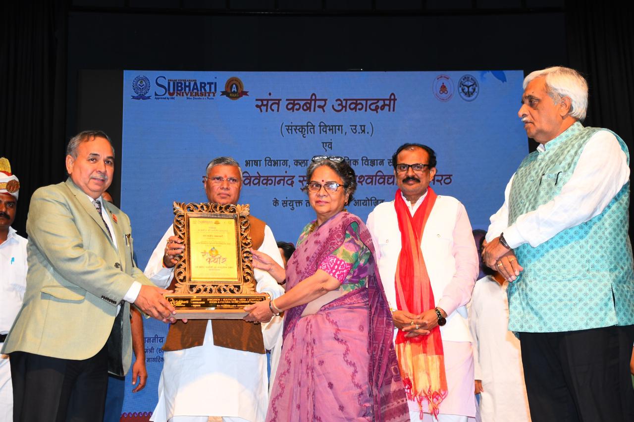 लखनऊ: 12 सितंबर, 2025मेरठः स्वामी विवेकानंद सुभारती विश्वविद्यालय मेरठ में भाषा विभाग, कला एवं सामाजिक विज्ञान संकाय, सुभारती विश्वविद्यालय, संत कबीर अकादमी (संस्कृति विभाग, उत्तर प्रदेश) के संयुक्त तत्त्वावधान में रंग कबीरः संगोष्ठी एवं सांस्कृतिक उत्सव का शुभारंभ हुआ। यह आयोजन 11 से 13 सितम्बर 2025 तक तीन दिवसीय स्वामी विवेकानंद सुभारती विश्विद्यालय, सुभारतीपुरम, मेरठ में आयोजित किया जा रहा है। इस कार्यक्रम के उद्धाटन सत्र में उत्तर प्रदेश सरकार के होमगार्ड्स विभाग एवं नागरिक सुरक्षा विभाग के राज्यमंत्री (स्वतंत्र प्रभार)धर्मवीर प्रजापति, श्रम एवं सेवायोजन मंत्री उत्तर प्रदेश डॉ. रघुराज सिंह, संत कबीर अकादमी के निदेशक अतुल द्विवेदी, स्वामी विवेकानंद सुभारती विश्वविद्यालय की कुलाधिपति डॉ. स्तुति नारायण कक्कड़, कुलपति प्रोफे.(डॉ.) पी. के शर्मा के द्वारा पारंपरिक रुप से दीप प्रज्ज्वलन के साथ हुआ। जनजाति लोक संस्थान के निदेशक अतुल द्विवेदी ने बताया कि इस महोत्सव के प्रथम दिन जहां व्कताओं ने अपने विचारों के माध्यम से कबीर के जीवन एवं उनकी शिक्षाओं पर चर्चा की वहीं राजेश जोशी लिखित एवं सुषमा शर्मा द्वारा निर्देशित नाटक कहन कबीर की प्रस्तुति ने उपस्थित दर्शकों को कबीर के संपूर्ण जीवन एवं विचारों से परिचित कराया। अपने अध्यक्षीय संबोधन में धर्मवीर प्रजापति, राज्यमंत्री (स्वतंत्र प्रभार) होमगार्ड्स विभाग एवं नागरिक सुरक्षा विभाग, उत्तर प्रदेश सरकार ने कहा कि कबीरदास जी आज के युग में भी प्रासंगिक हैं। उन्होंने बिना जाति, धर्म, पंथ का भेद किए सभी को समभाव एवं समदृष्टि से देखा। उनके लिए सभी समान थे। उनके दोहे, एवं चौपाइयों में मानवीय मूल्यों एवं जीवन दर्शन की गहरी समझ मिलती है। कबीर के विचारों को यदि आज भी हम अपनाएं या उनके बताए रास्ते पर चलें तो जीवन को हम भी सुगम एवं सुखी बना सकते हैं।